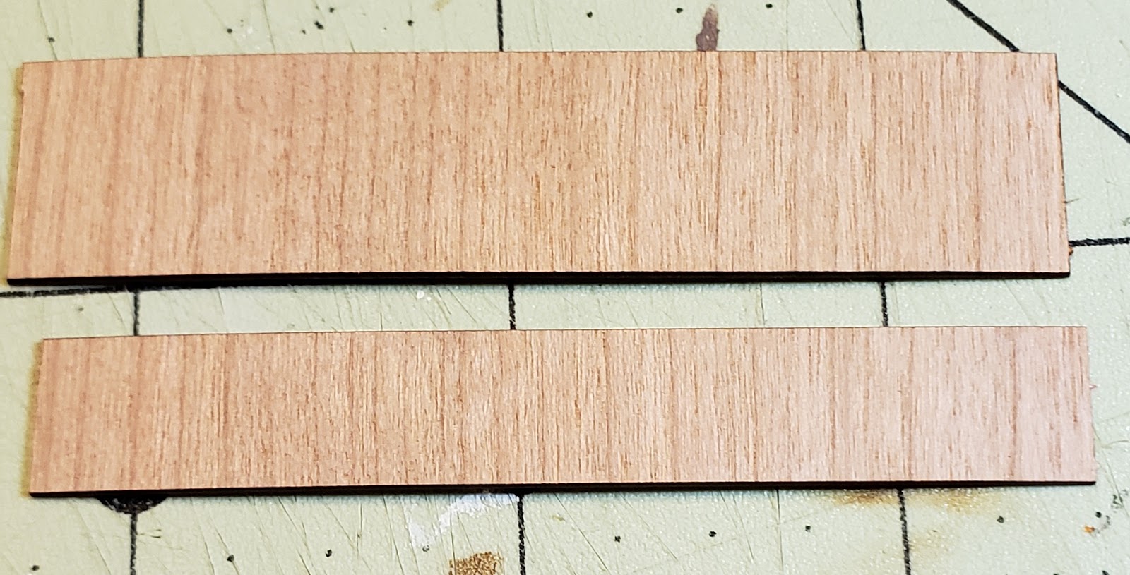 At the top of this picture above is the front counter assembly. The one at the bottom was the back and what I had to remove the veneer from. (Note how the back counter is taller. That gap of veneer at the bottom made sense to me looking at the pictures in the instructions. But that is not how it is supposed to work.) There is another narrow basswood piece that goes on the veneer on the front.